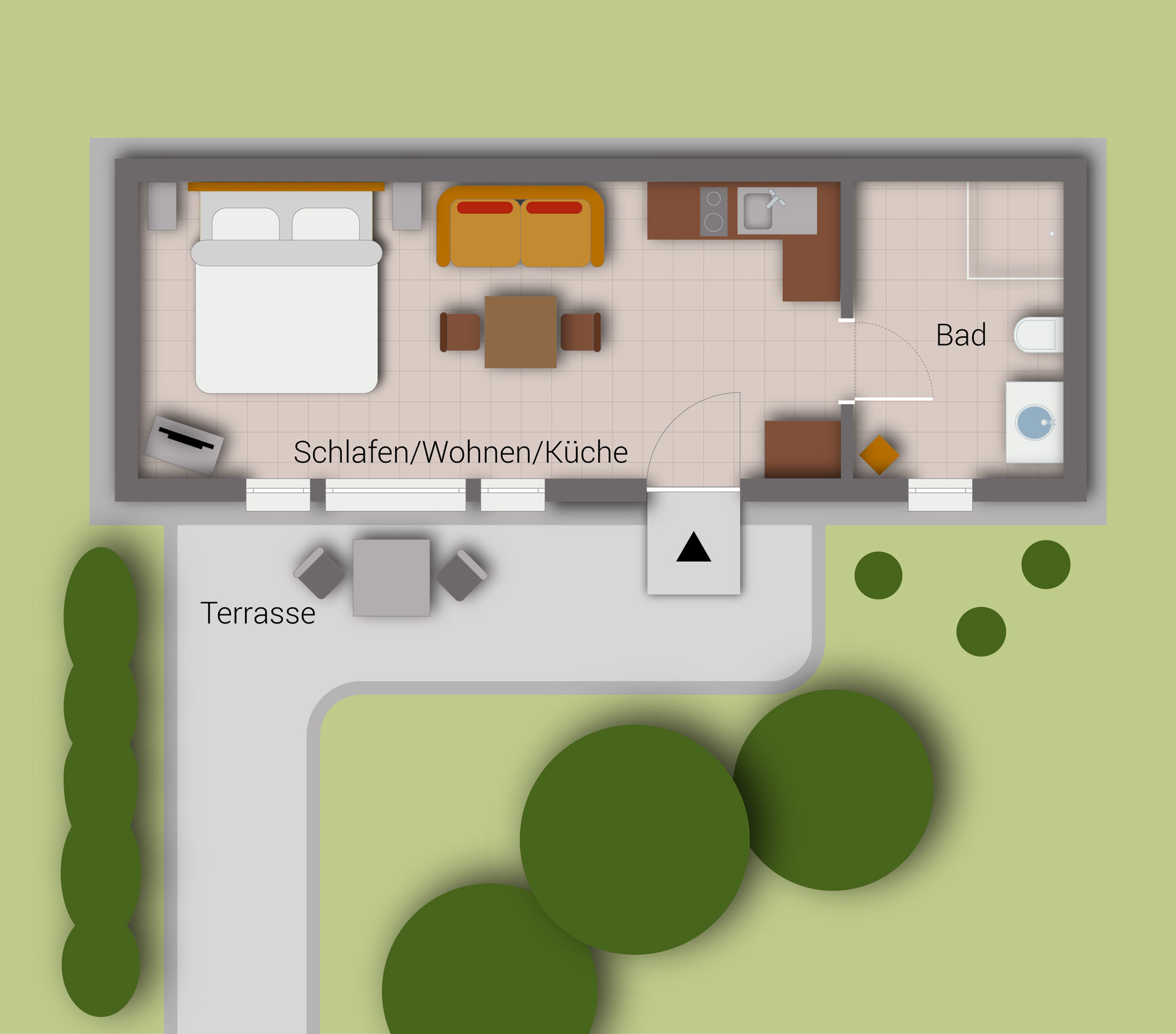 Das ebenerdige Studio im Bungalowstil mit einem offenen Wohn- und Küchenbereich und Doppelbett bietet Ihnen auf 30 Quadratmetern Platz bis zu 2 Personen. Die anliegende Terrasse ist mit Gartenmöbeln sowie einem Grill ausgestattet.